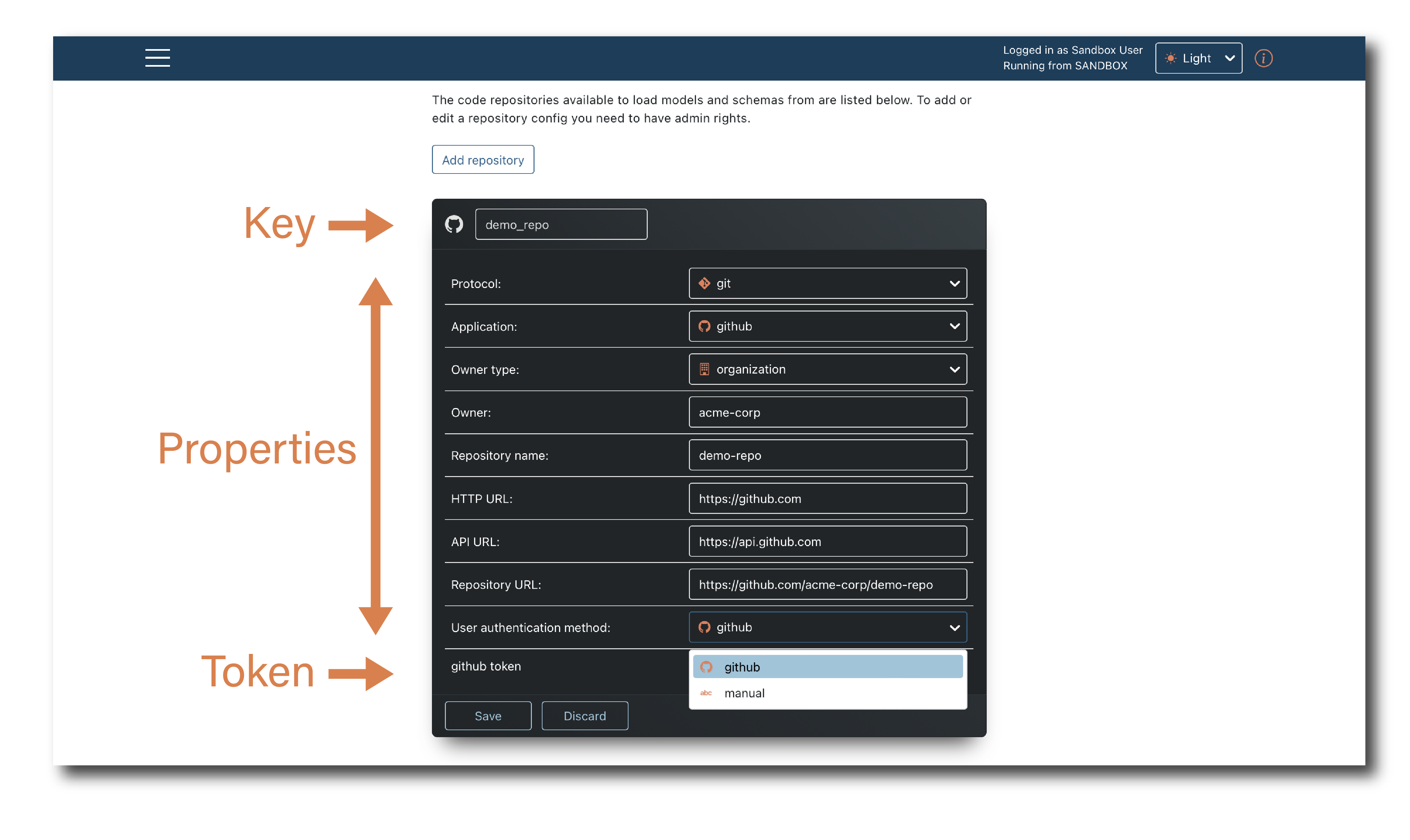 User authentication method defines how users browsing the repository to select models for import are authenticated. The two options are via the OAUTH application (github-auth) or using PAT tokens (Manual).