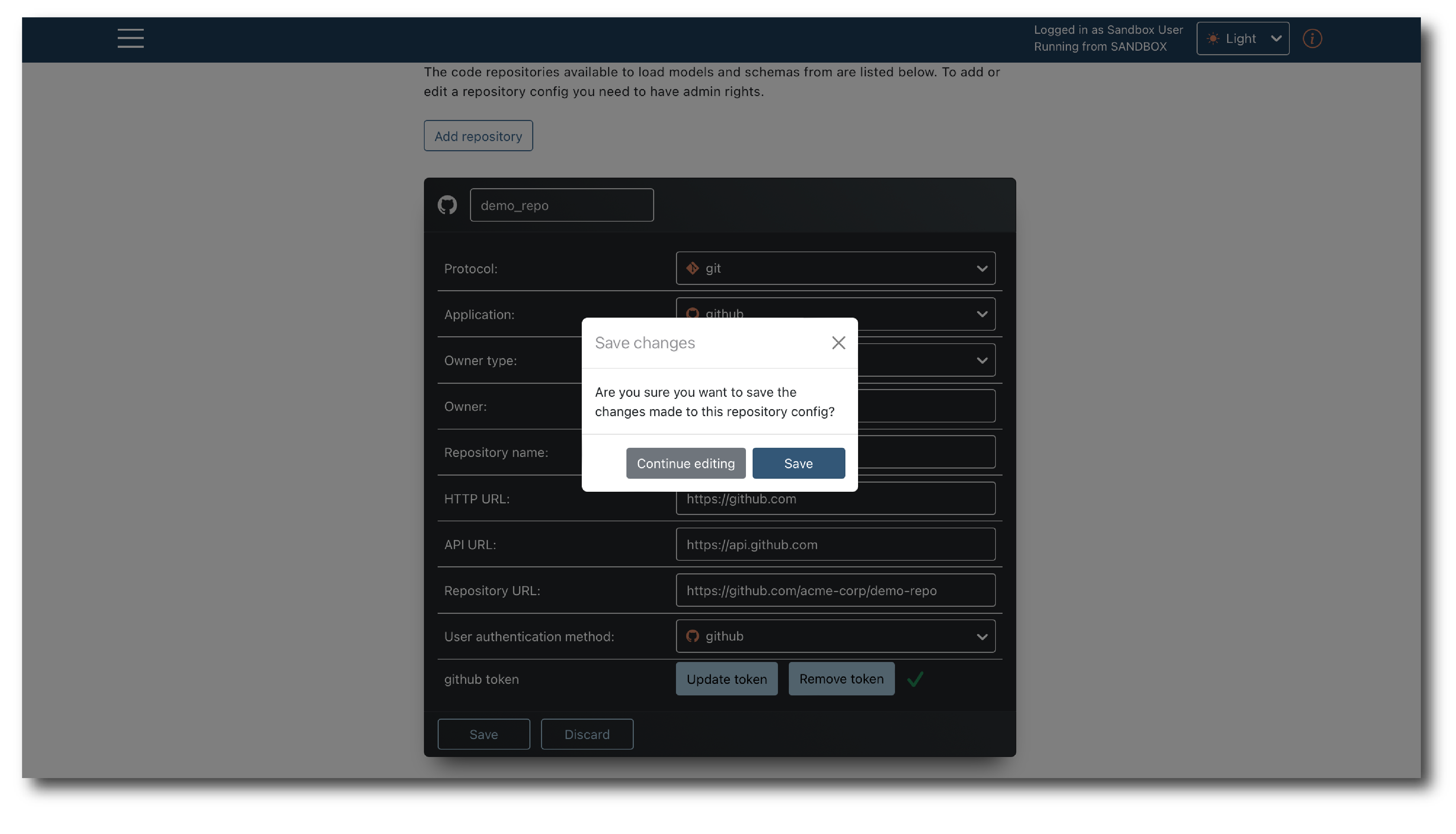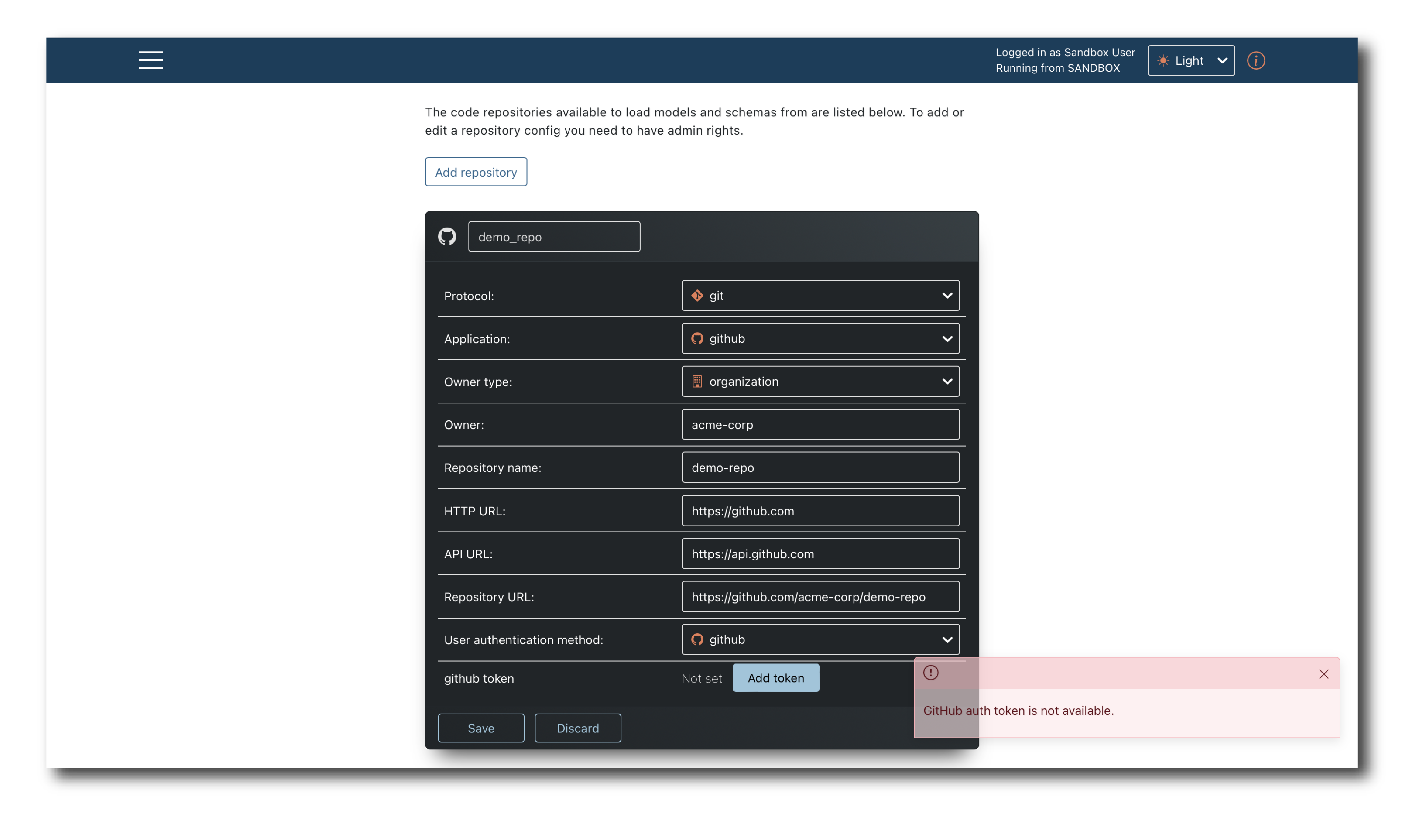 Basic format validations on the repository properties are completed here but the repo connection is not tested. Some errors and access issues may not be identified until trying to import a model.