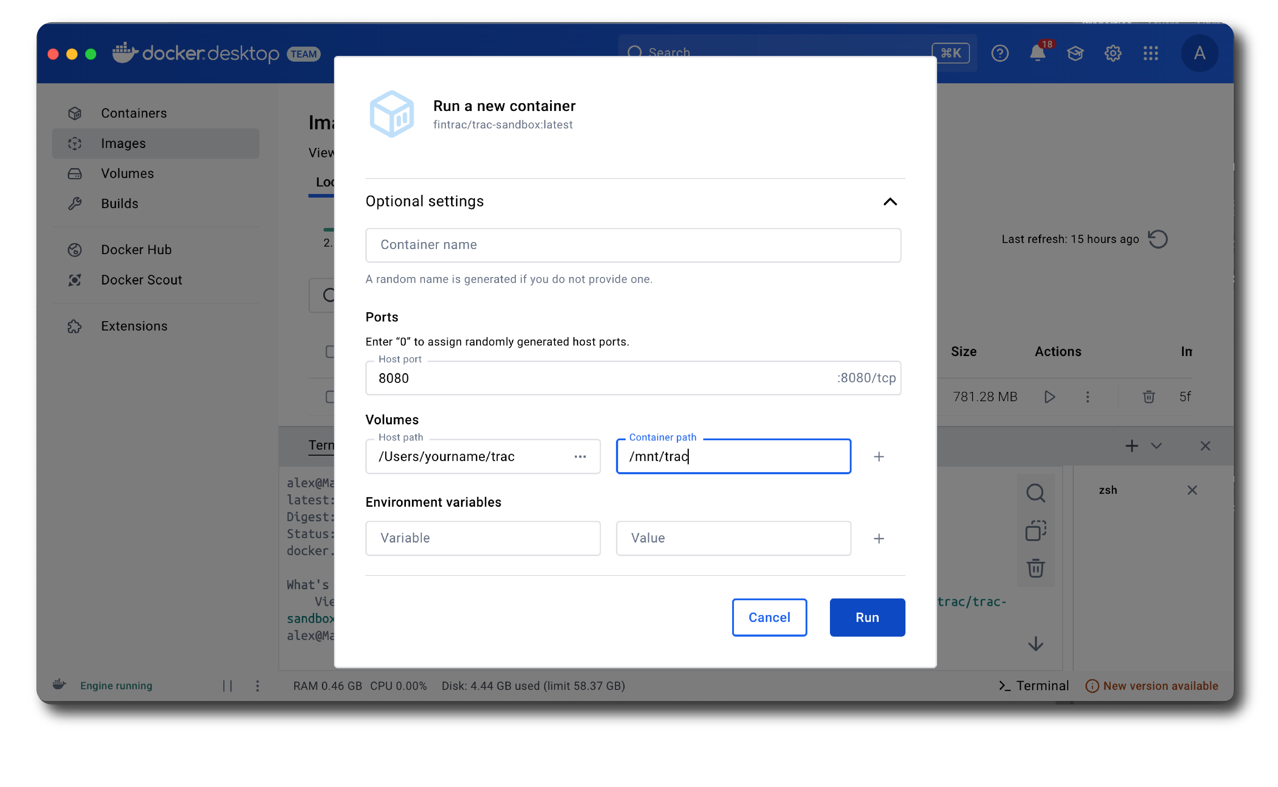 The host port should be 8080. The container path is /mnt/trac. For the host path, create an empty folder on your local machine and select that.