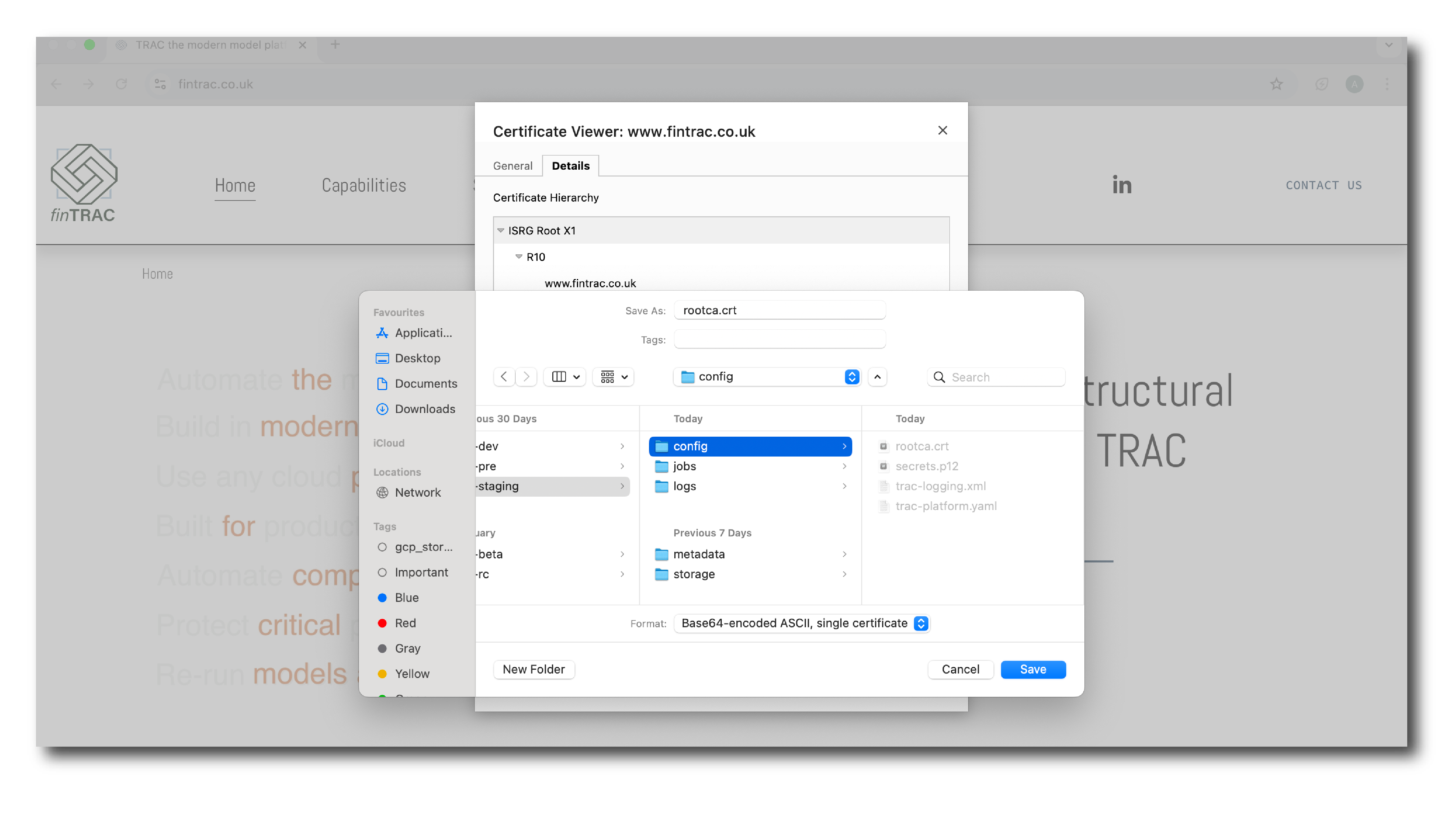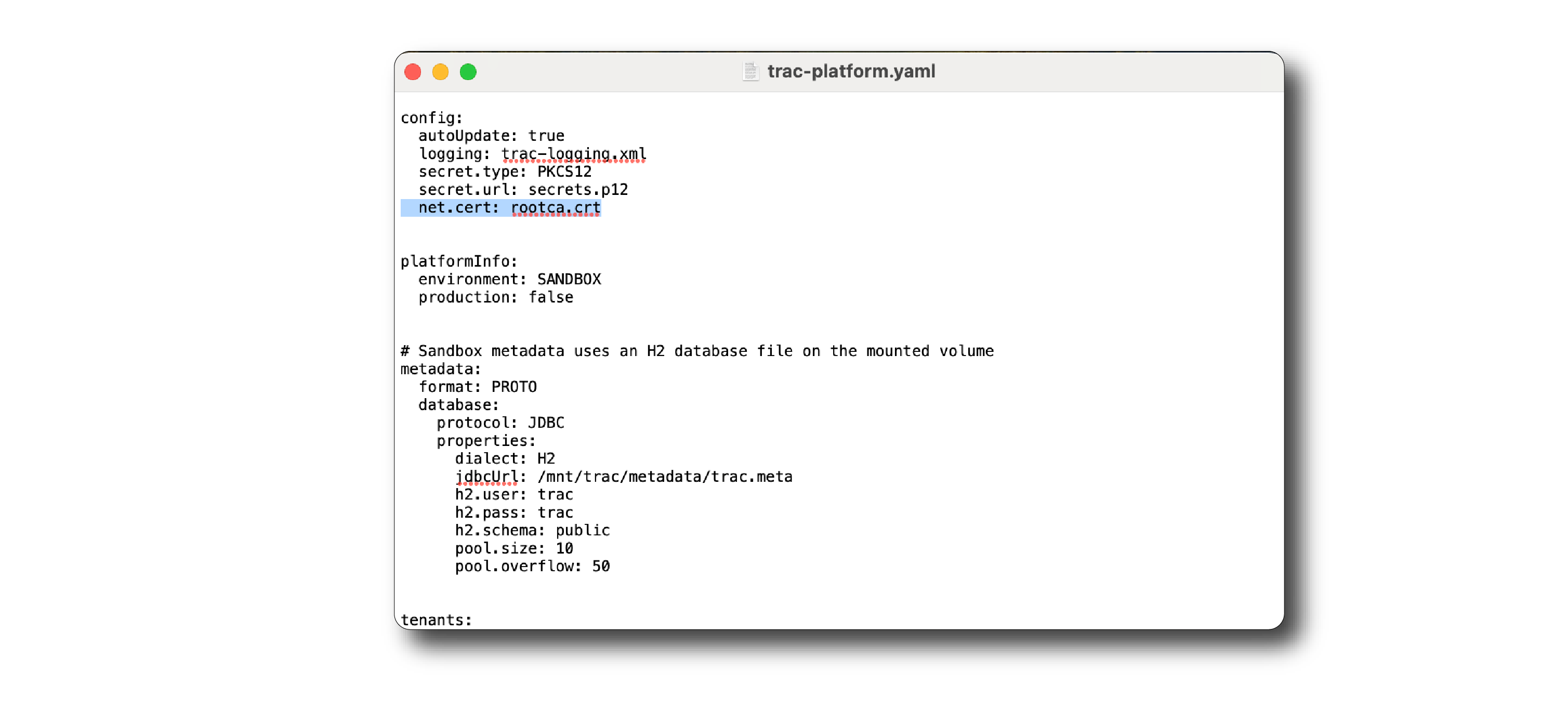 Finally, open the trac-platform.yaml file in your TRAC directory and add a reference to the root certificate in the top section, as highlighted.