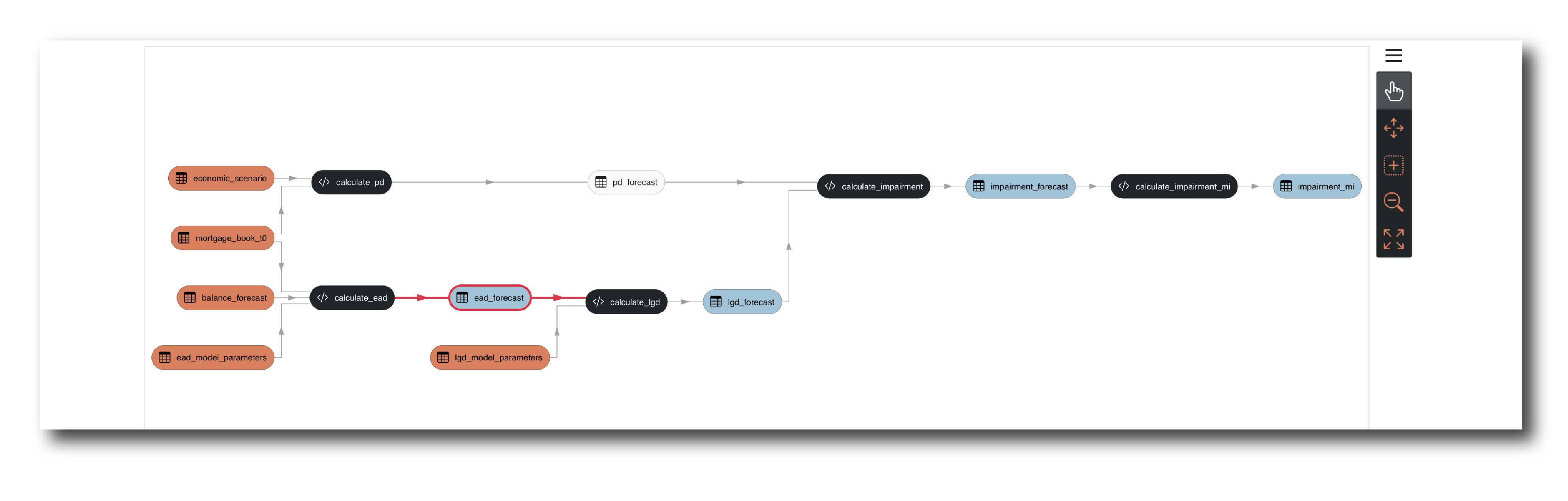 Down the page is a first draft of the Flow TRAC has built. The graph has an internal link where an output of one Model has the same Key as an input for another. Any inputs that cannot be sourced with an internal link are treated as inputs (orange).