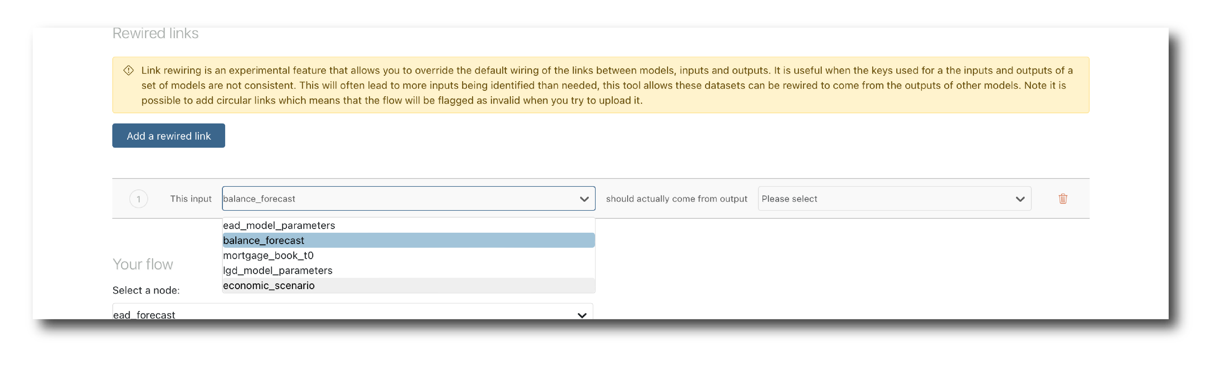 The rewiring tool allows you to replace Input data (orange) with an internal link, by manually mapping the Key of a Model’s output to the Key of another Model’s input. Manual rewiring works if the data sets have different Keys but their schema’s are consistent.