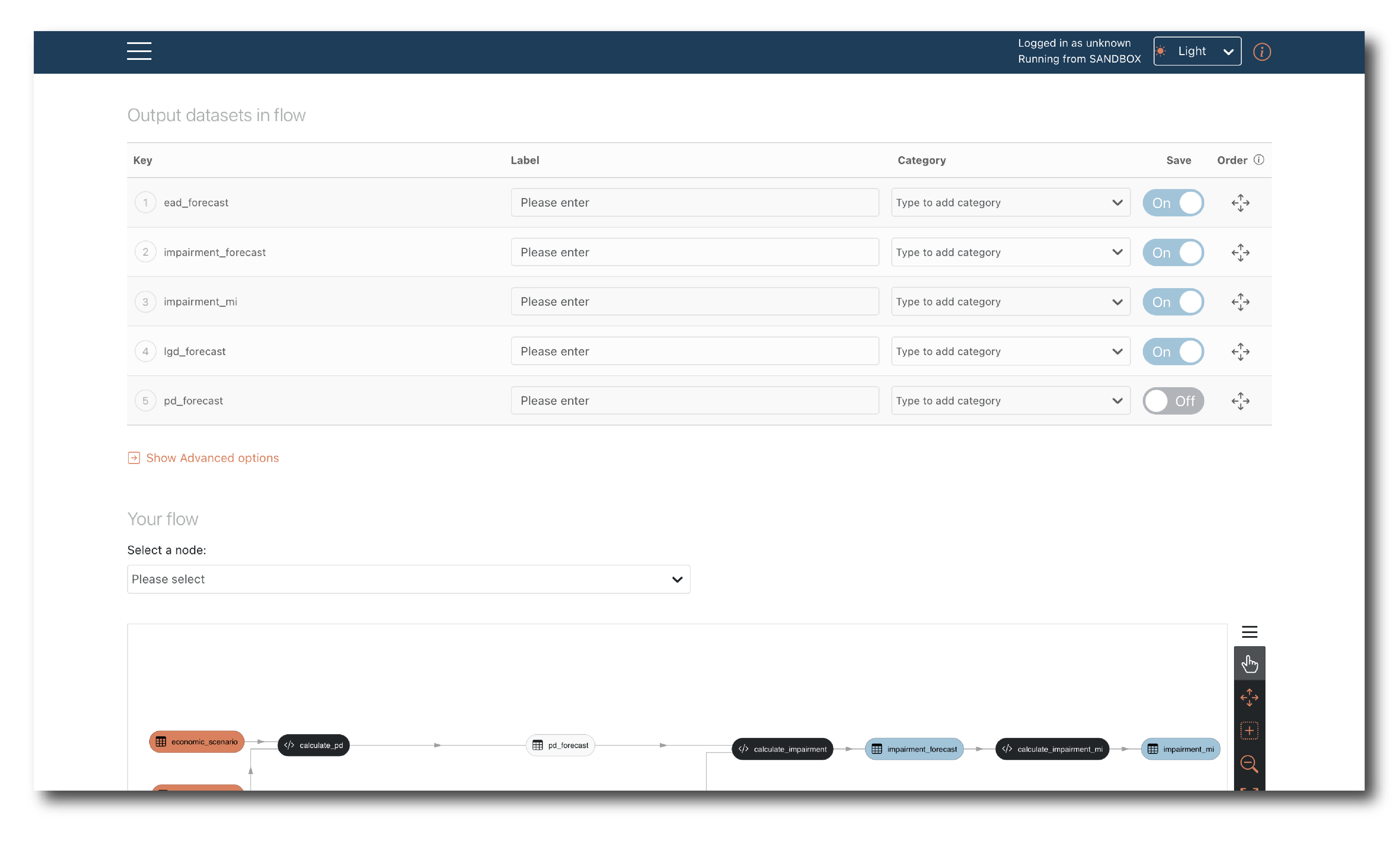 The ‘Save’ toggle on the list of Outputs allows you to change a node in the Flow between Intermediate (grey) and Output data (blue). Intermediates are not included in the results when the Flow is run.