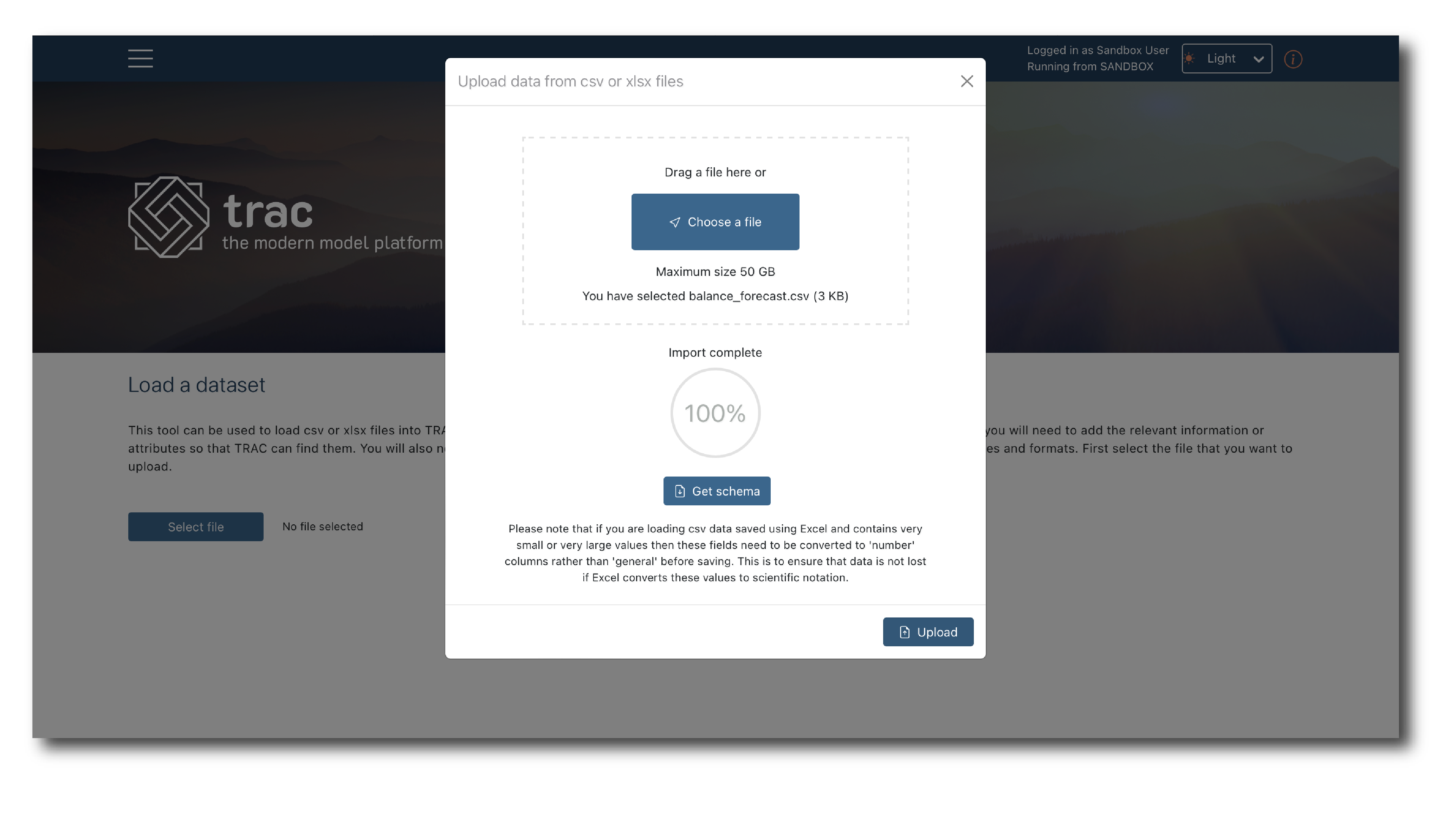 Locate and select the file, click ‘Get schema’ and if you see ‘Import 100% complete’ click ‘Upload’.
