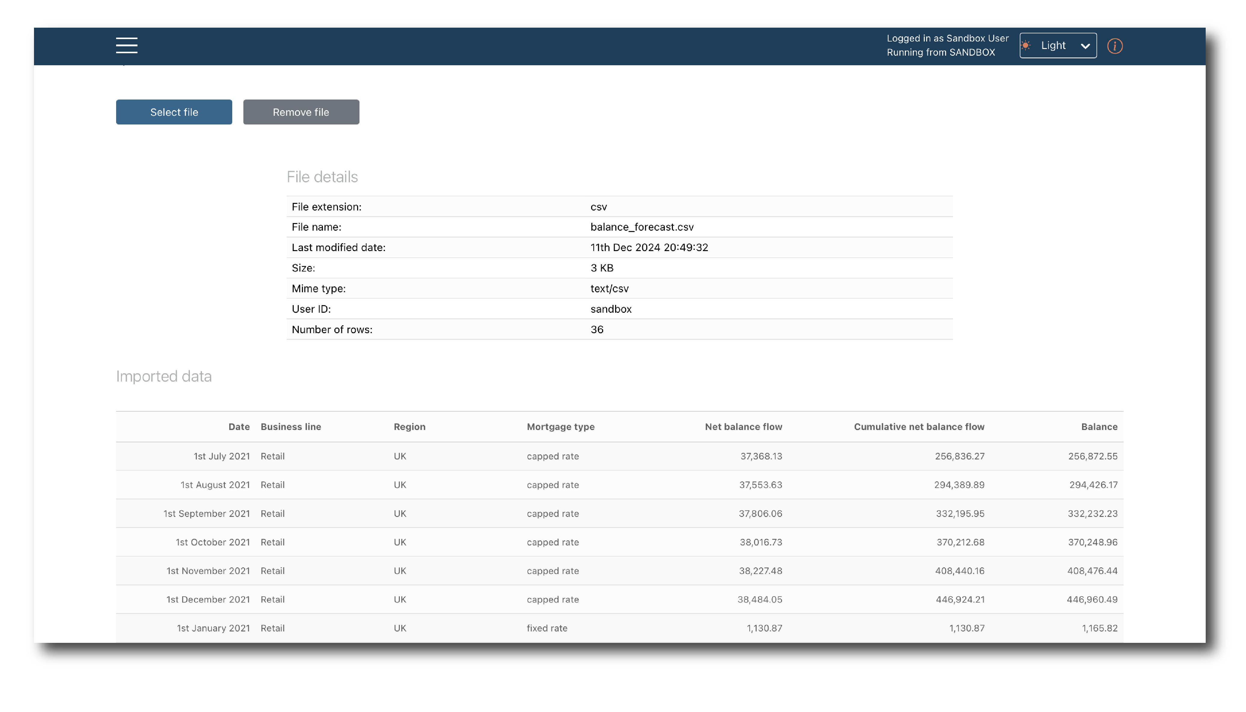 The file has been selected but to complete the import you need to review and label it. The top of the page shows the system generated tags (‘File details’) and previews the first 100 rows (‘Imported data’).