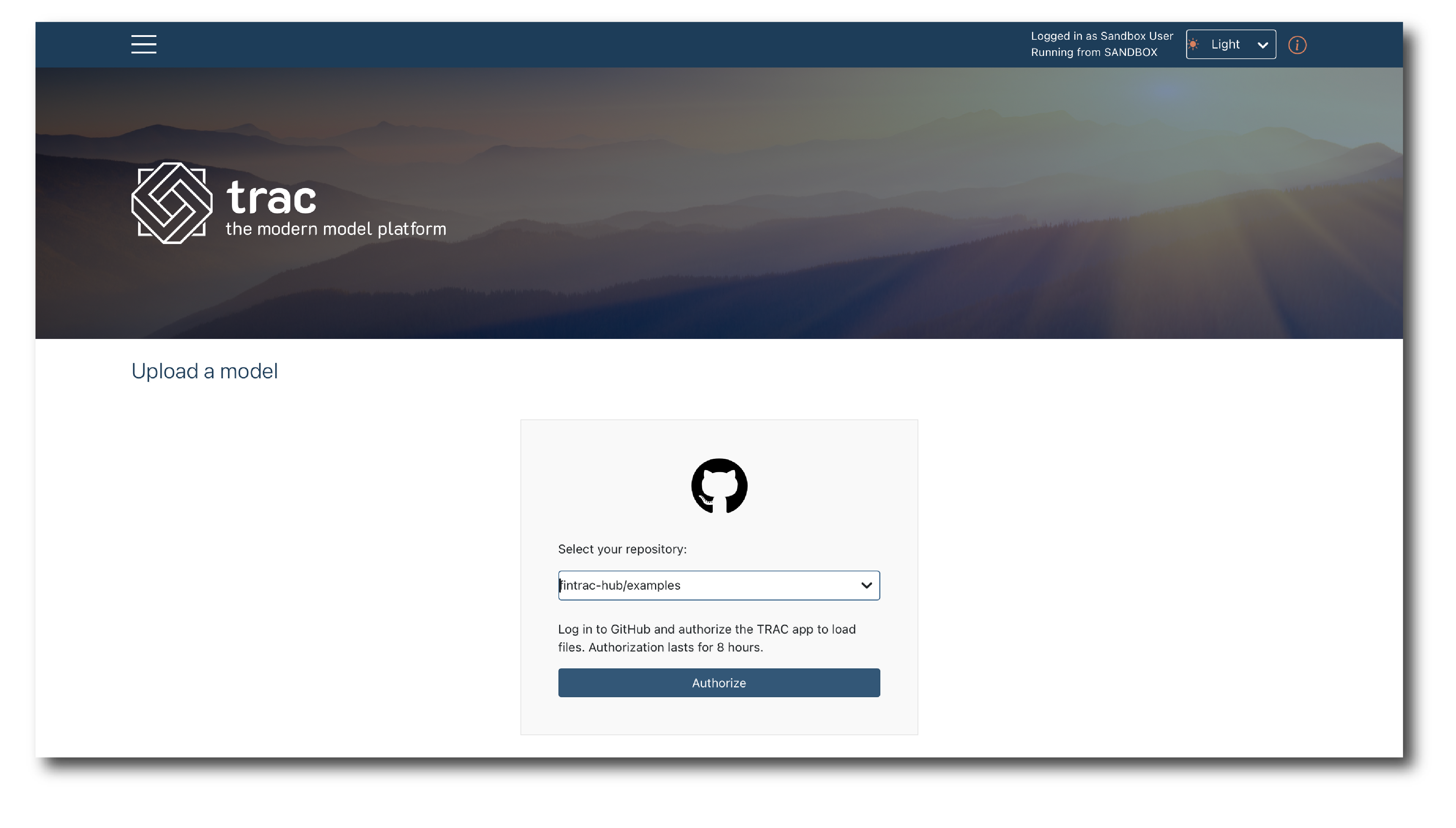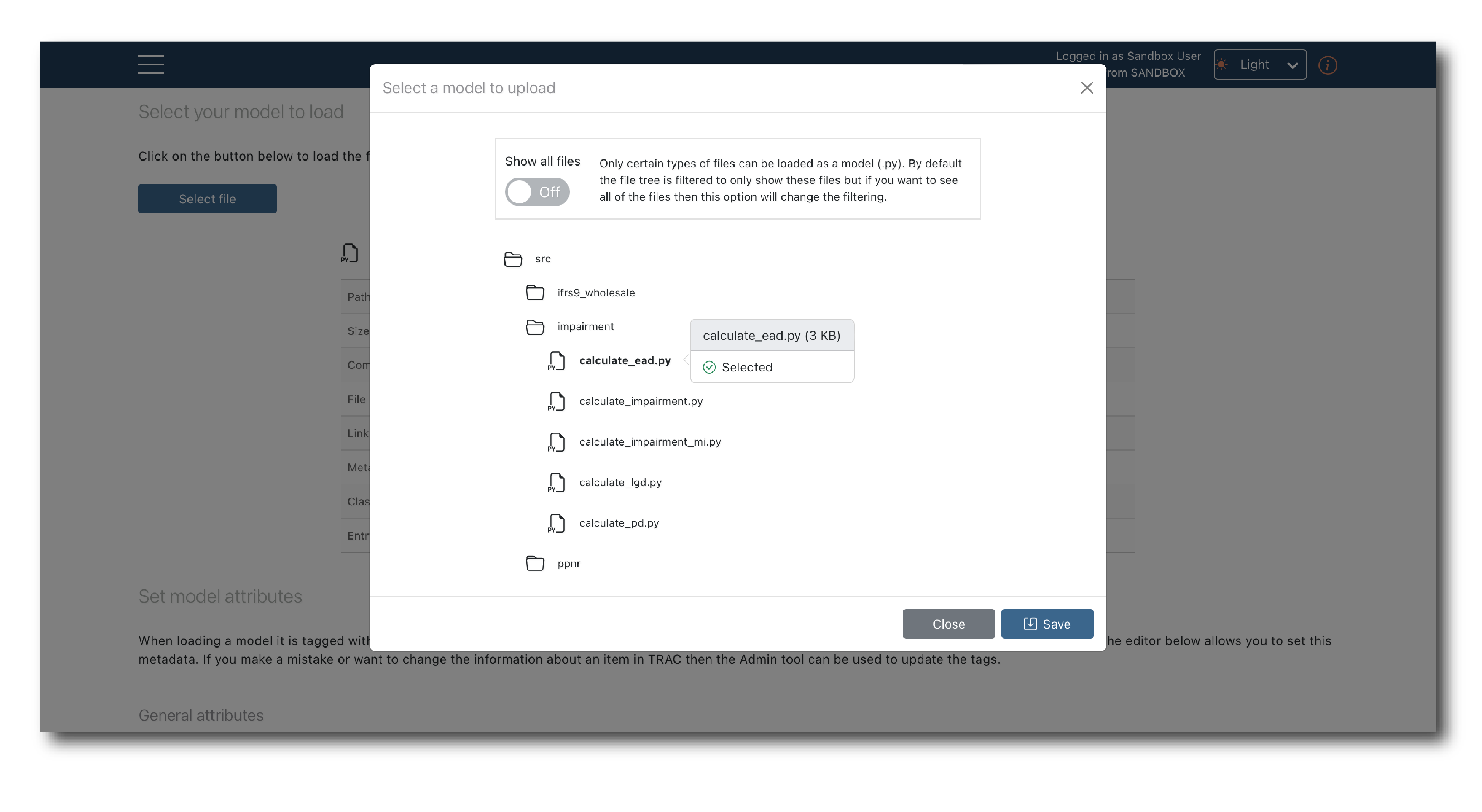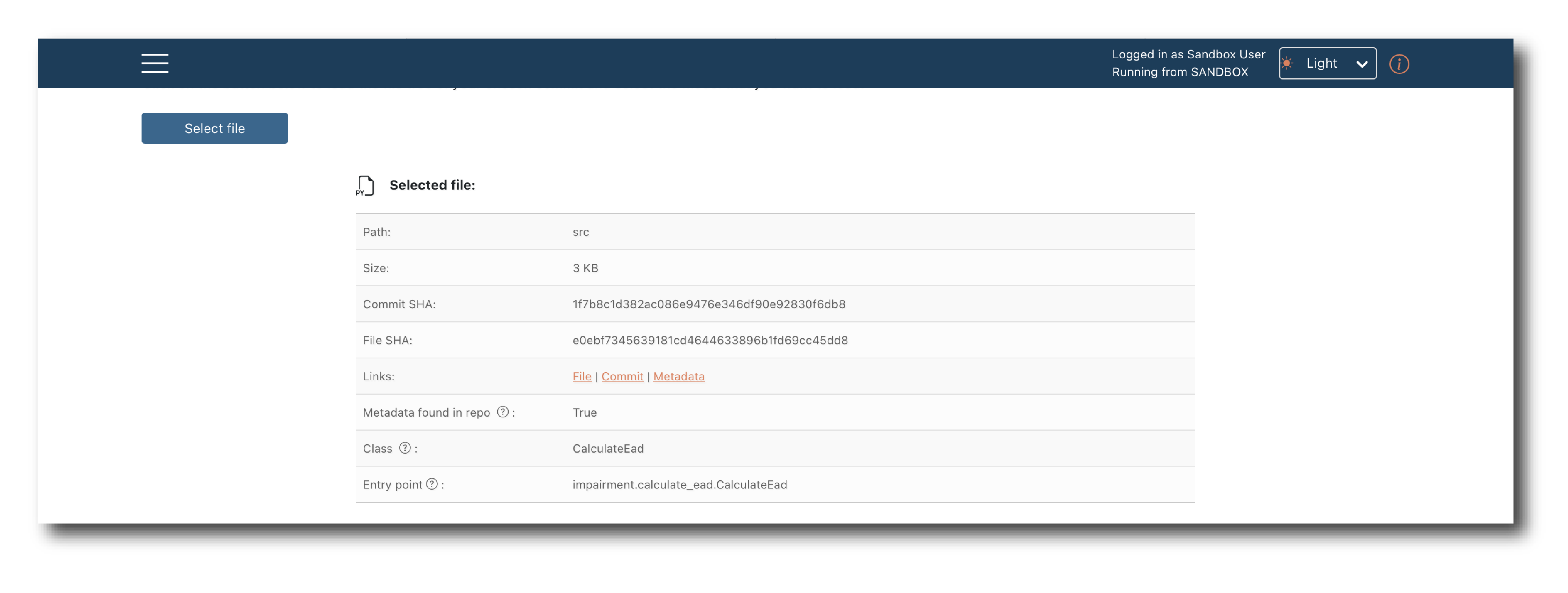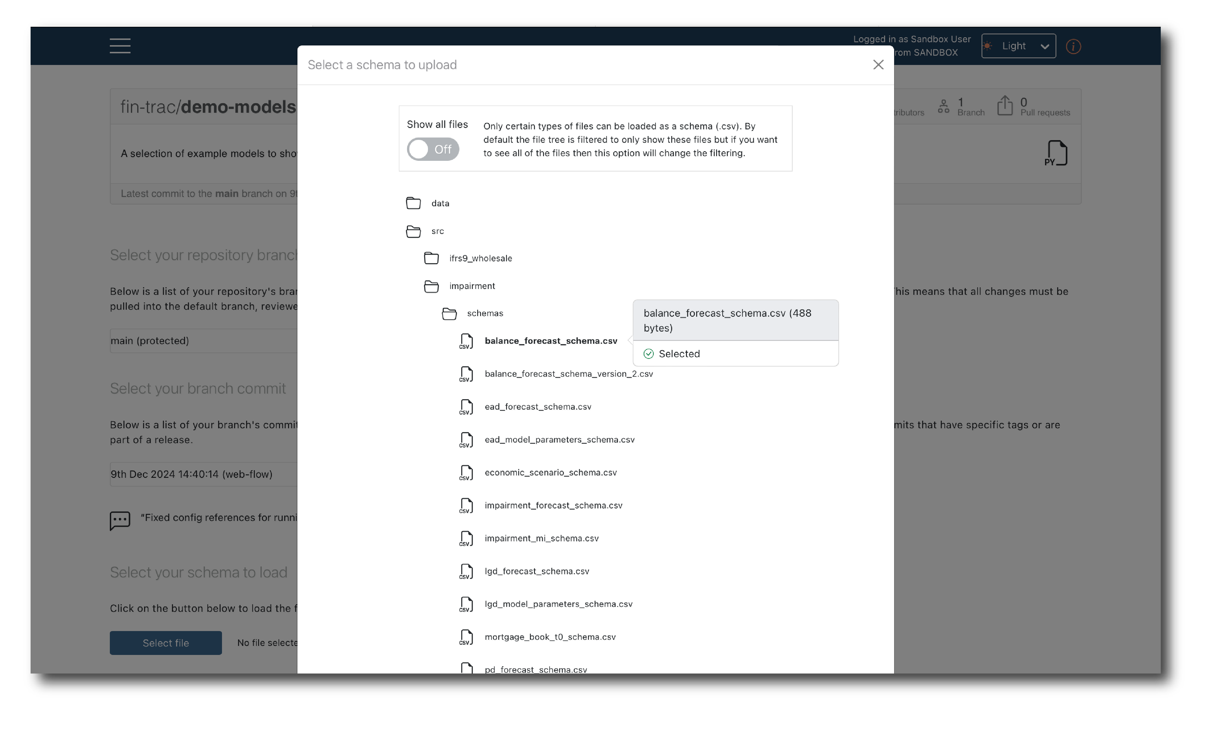 Once authorized, select the branch and commit and then click ‘Select file’, to open a pop-up showing the file structure and available models.