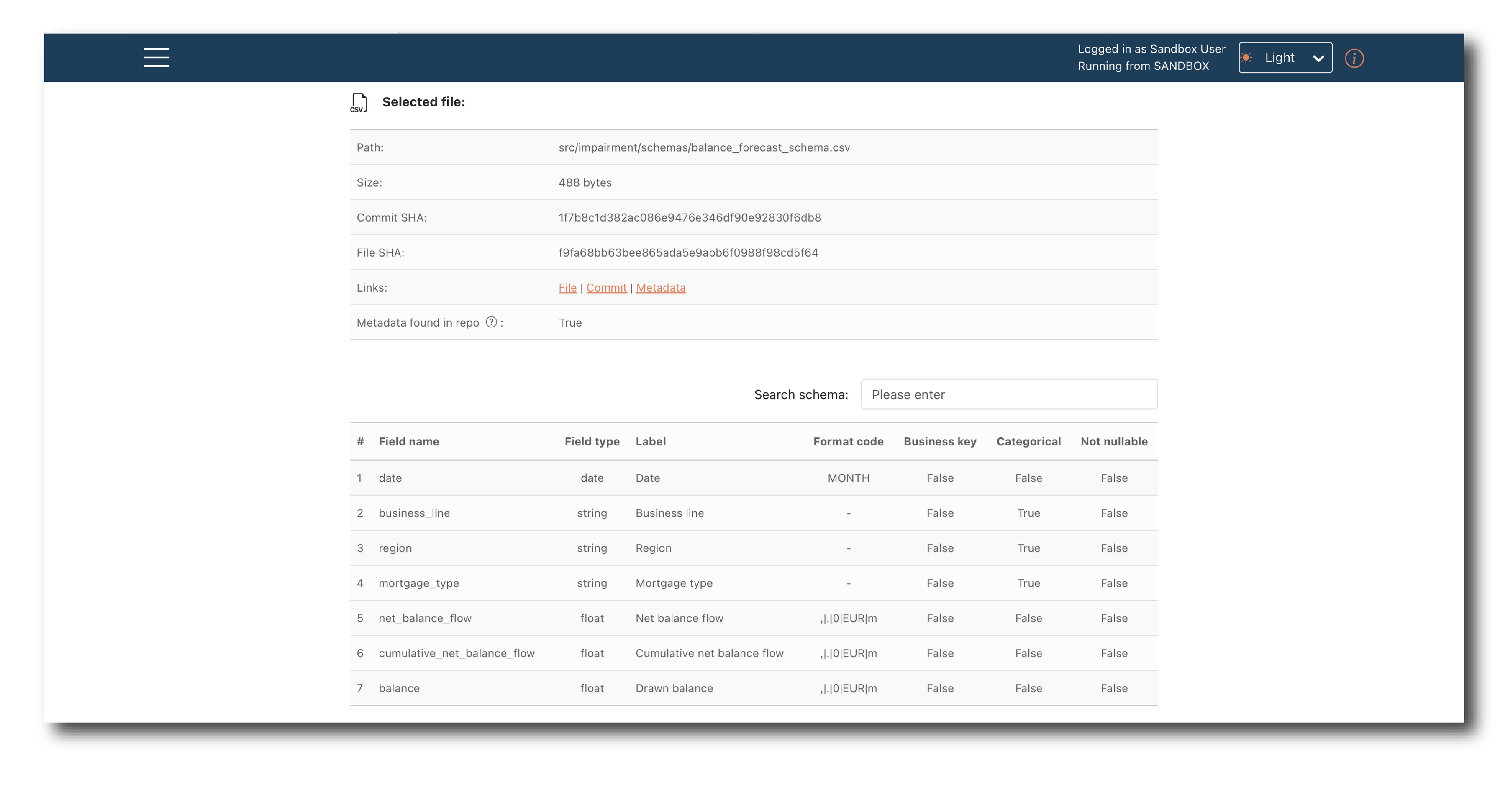 First log-in, then select the branch and commit, locate the schema file and click ‘Select file’. A pop-up window will appear showing the files than can be selected.