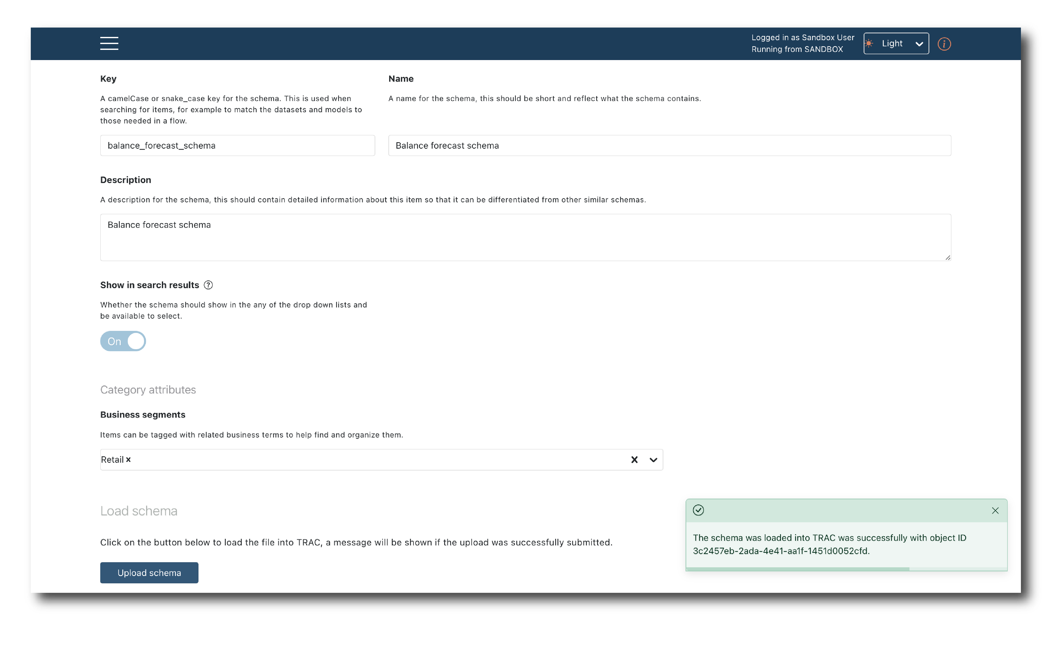 Schemas are an important part of how TRAC understands data and models. They can be embedded into those objects, or loaded as independent schema objects and re-used.