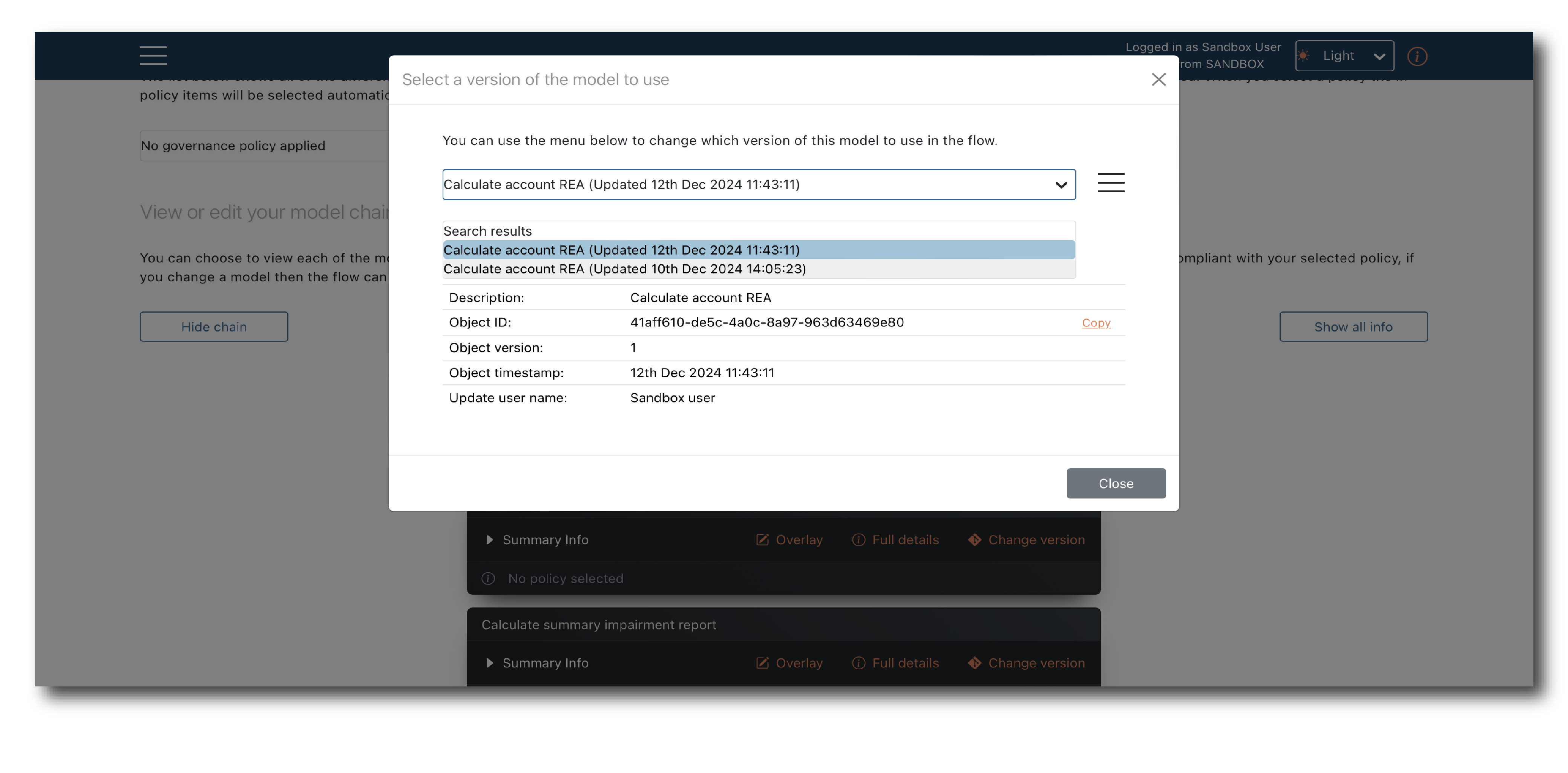 If more than one Model matches the criteria for use in the Flow, the most recent version is selected. This can be manually changed by clicking ‘Change version’.